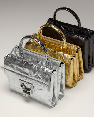 "Arlettis 10th Anniversary": a limited edition of 750 numbered pieces, 250 for each color variant. Offered in three shades, gold, silver, and liquid black, the collection expresses a new refined elegance through metallic leathers with a craquelé finish, paired tone-on-tone with the metal fittings. With its unmistakable structure, "Arlettis 10th Anniversary" in the refined Gun Metal shade is a tribute to the perfect balance between heritage and innovation.