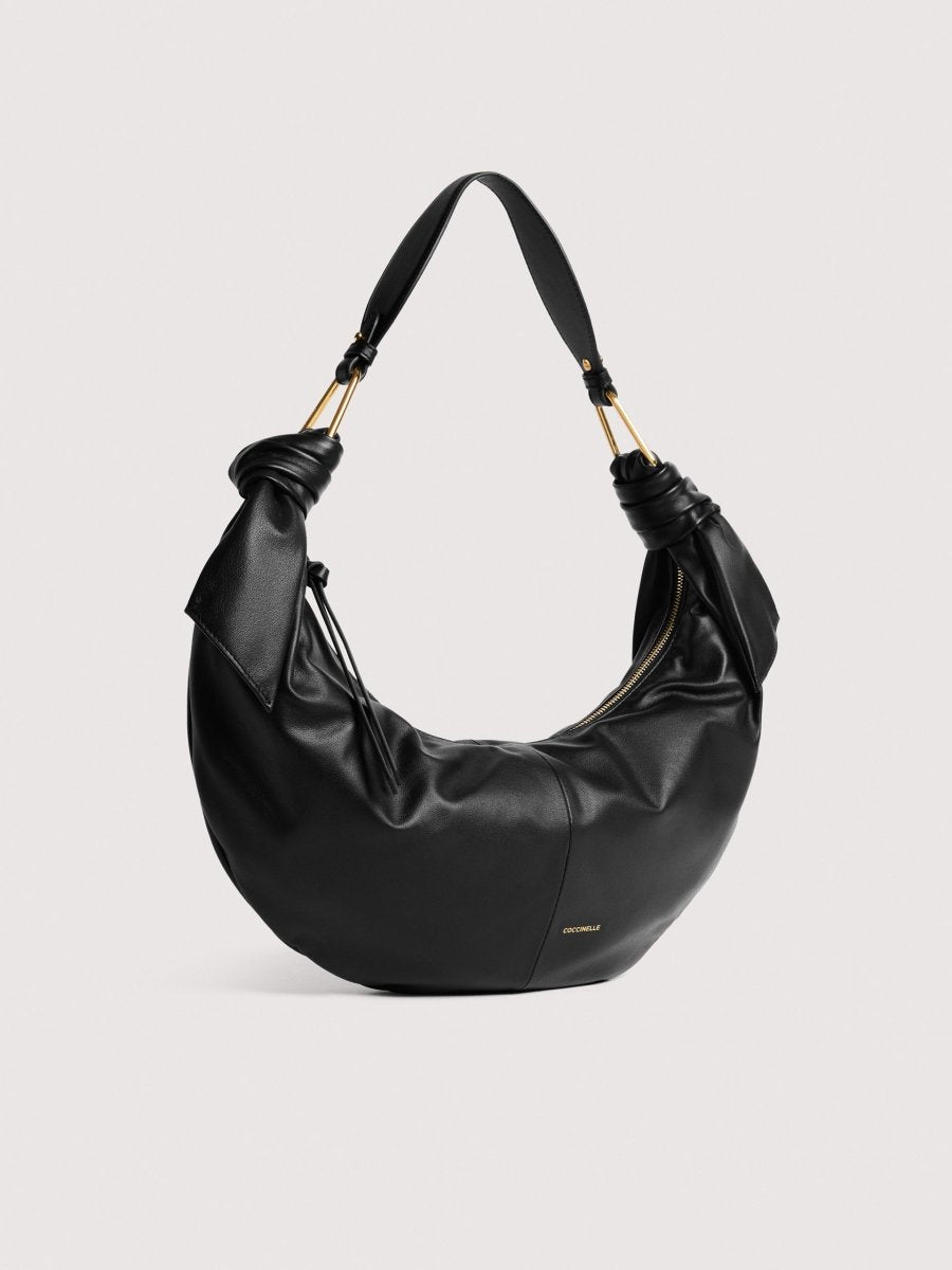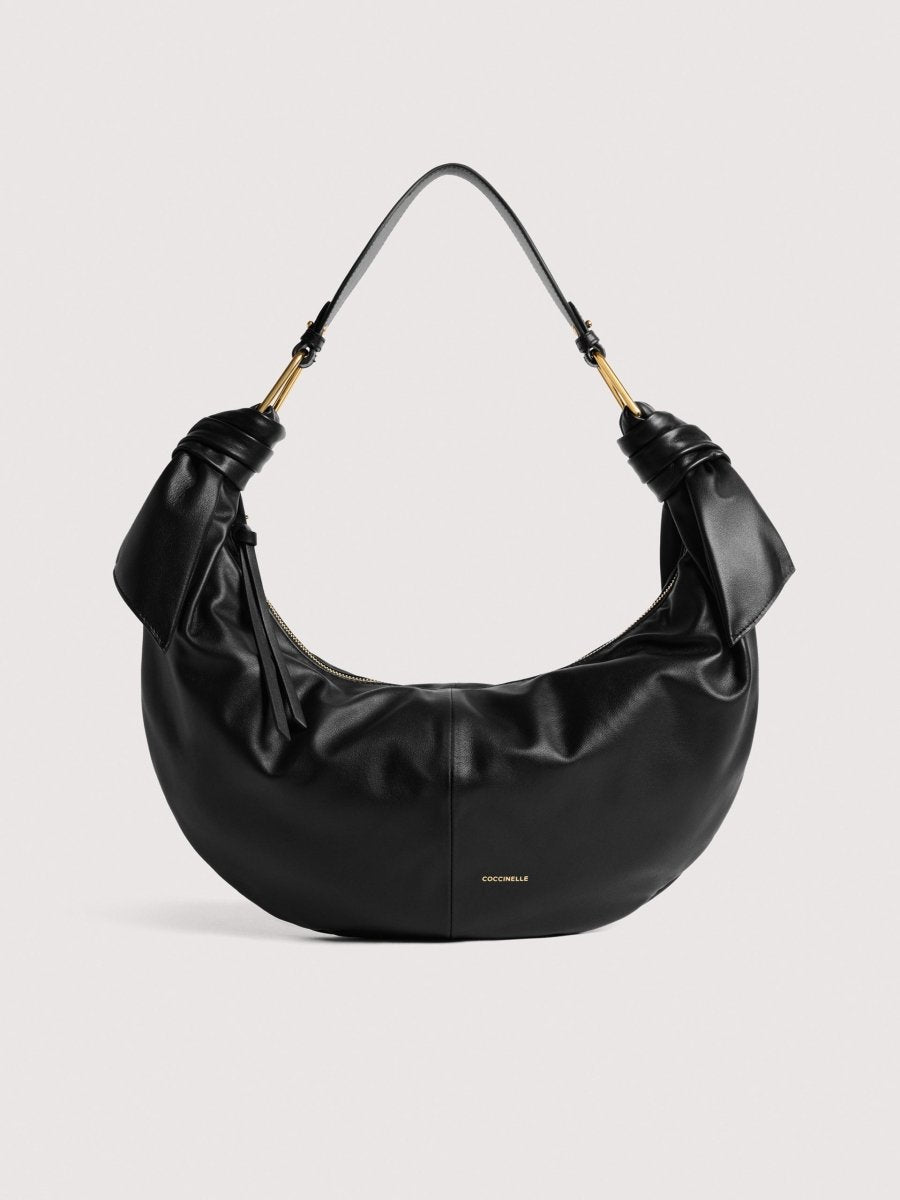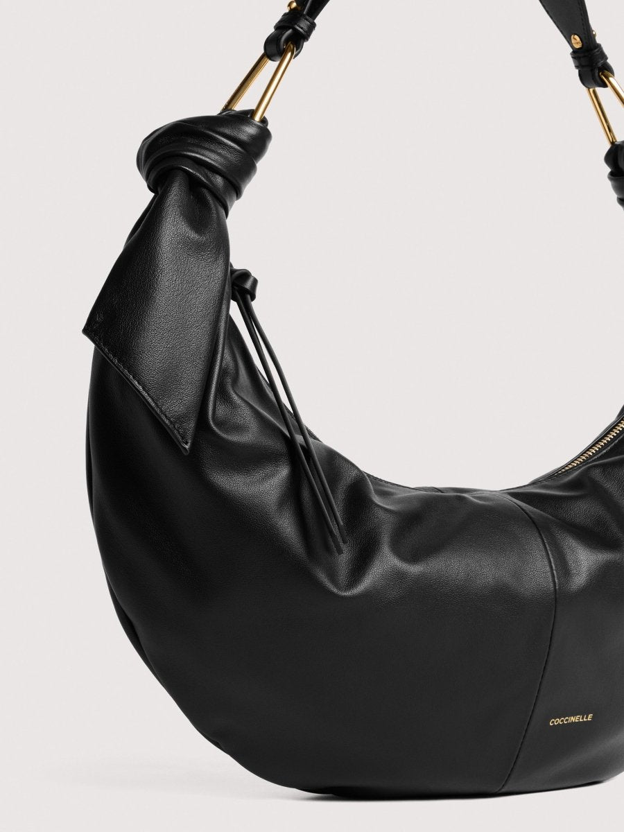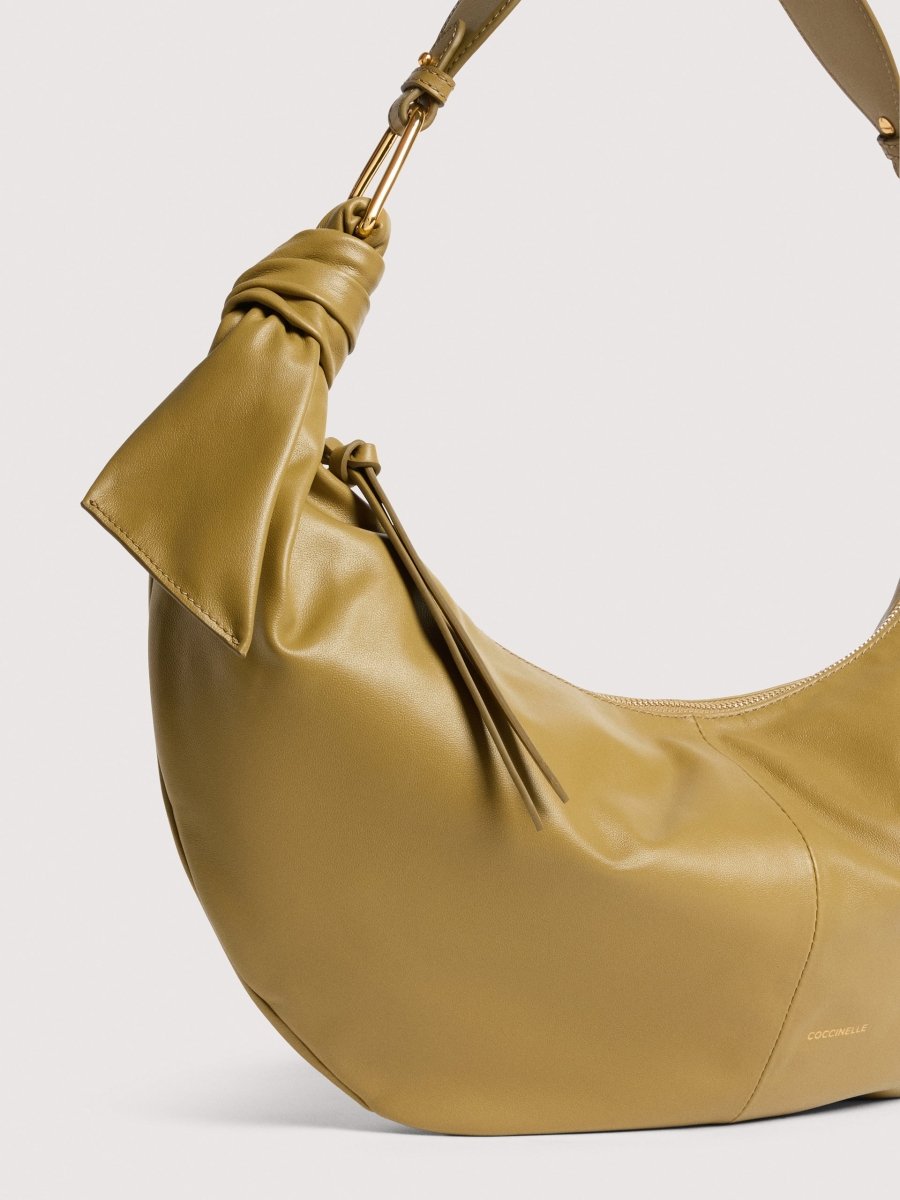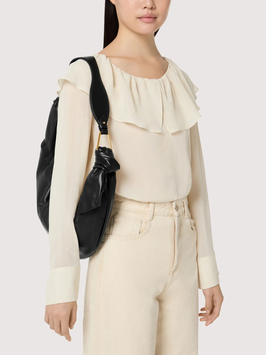 The line takes its name and inspiration from Japanese Furoshiki, square pieces of cloth that have been used since ancient times to carry all kinds of items. The line captures the essence of this tradition: smooth leather is knotted and draped around the metal plectrums to shape the bags that make up this line, creating light, feminine and contemporary styles. This model is made with smooth leather, tanned with special oils that make it soft to the touch. Despite its silky appearance, the leather is weather-resistant thanks to the use of resins that make the leather slightly waterproof while maintaining its natural appearance.