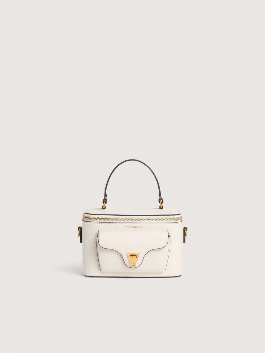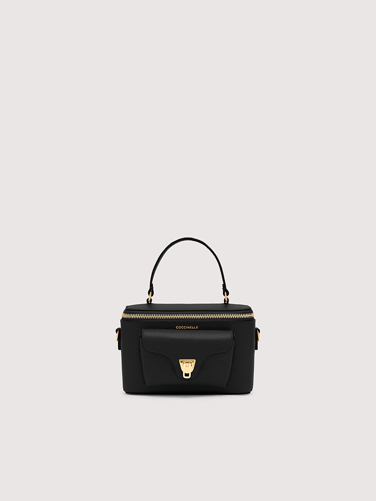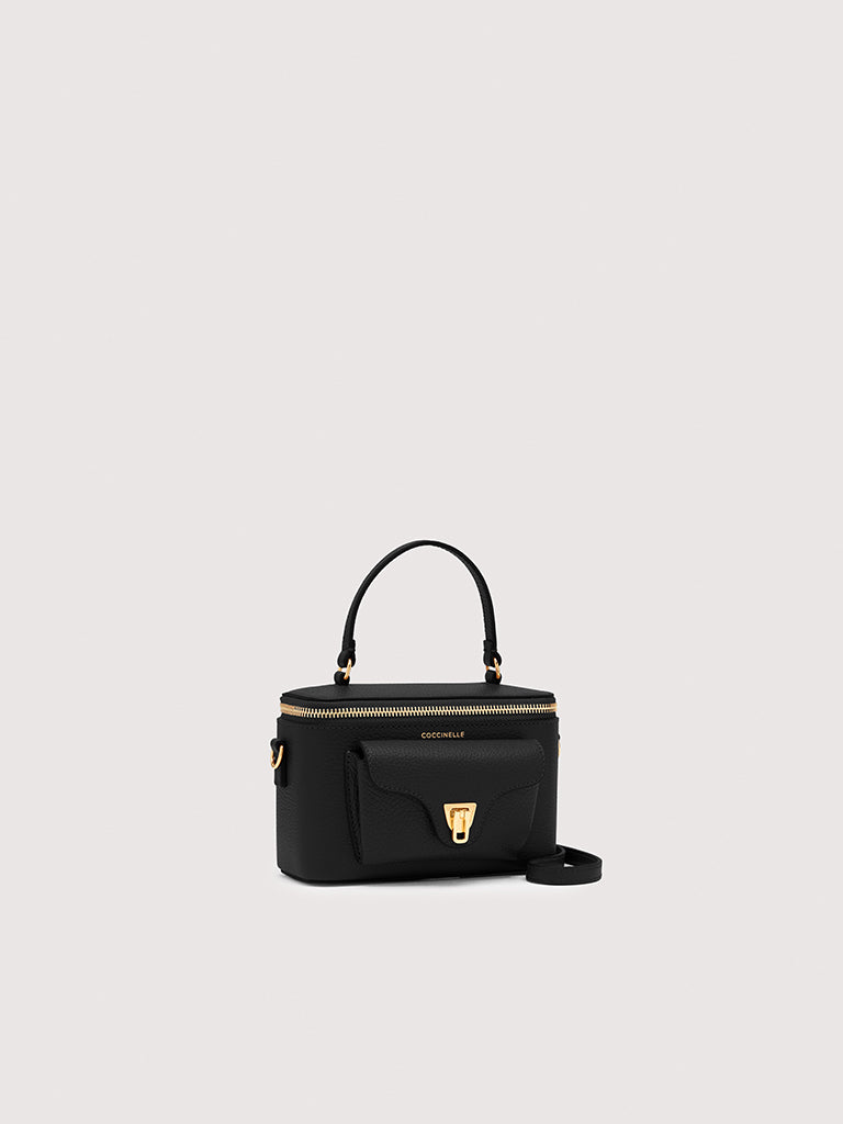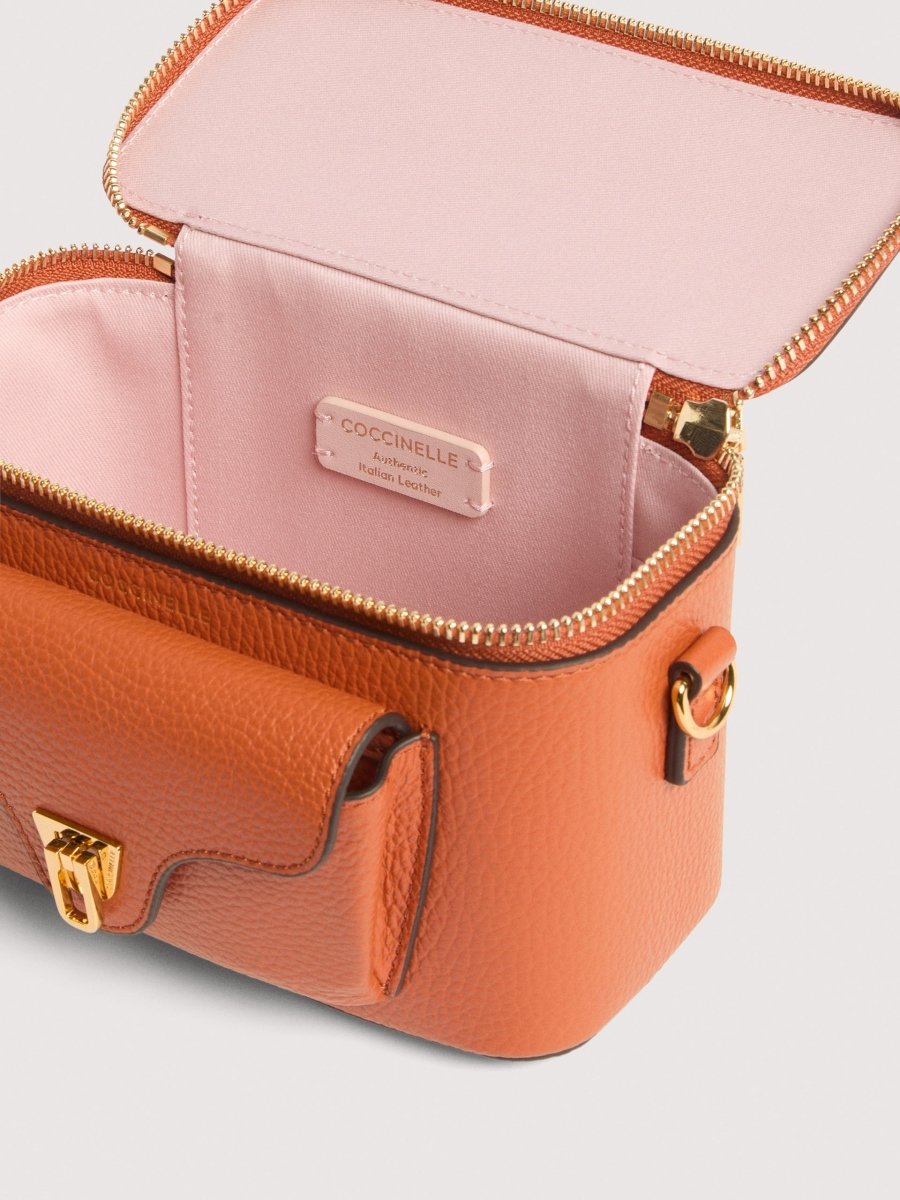 Coccinelle Beat is one of the brand’s iconic lines: the distinctive flap closure with plectrum is the symbol of Coccinelle’s identity. This mini vanity case with leather shoulder strap is a perfect mix of structure and softness, practicality and contemporary design. This model is made with leather processed using specialised machines and then tumbled to maintain its softness. This is a very robust, easy to clean leather, making it ideal for everyday use.