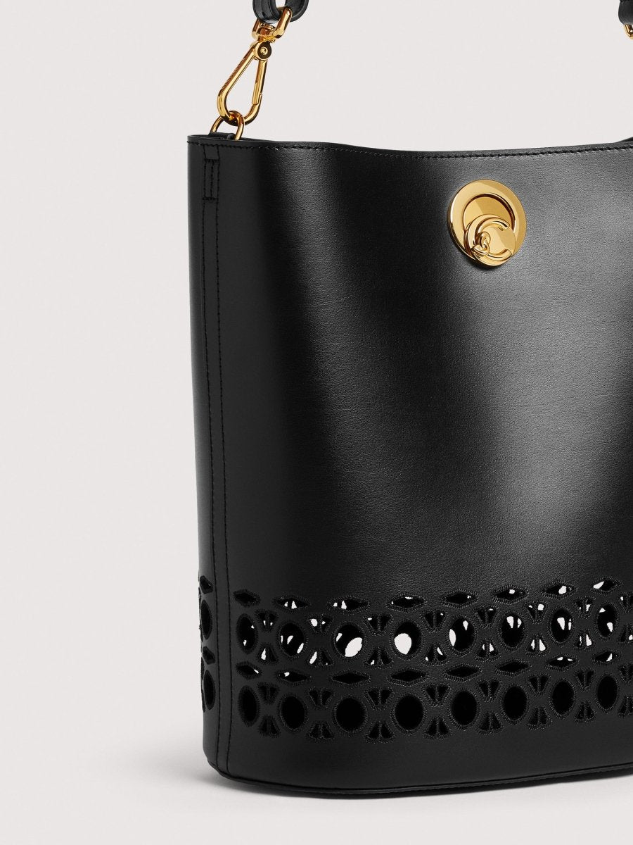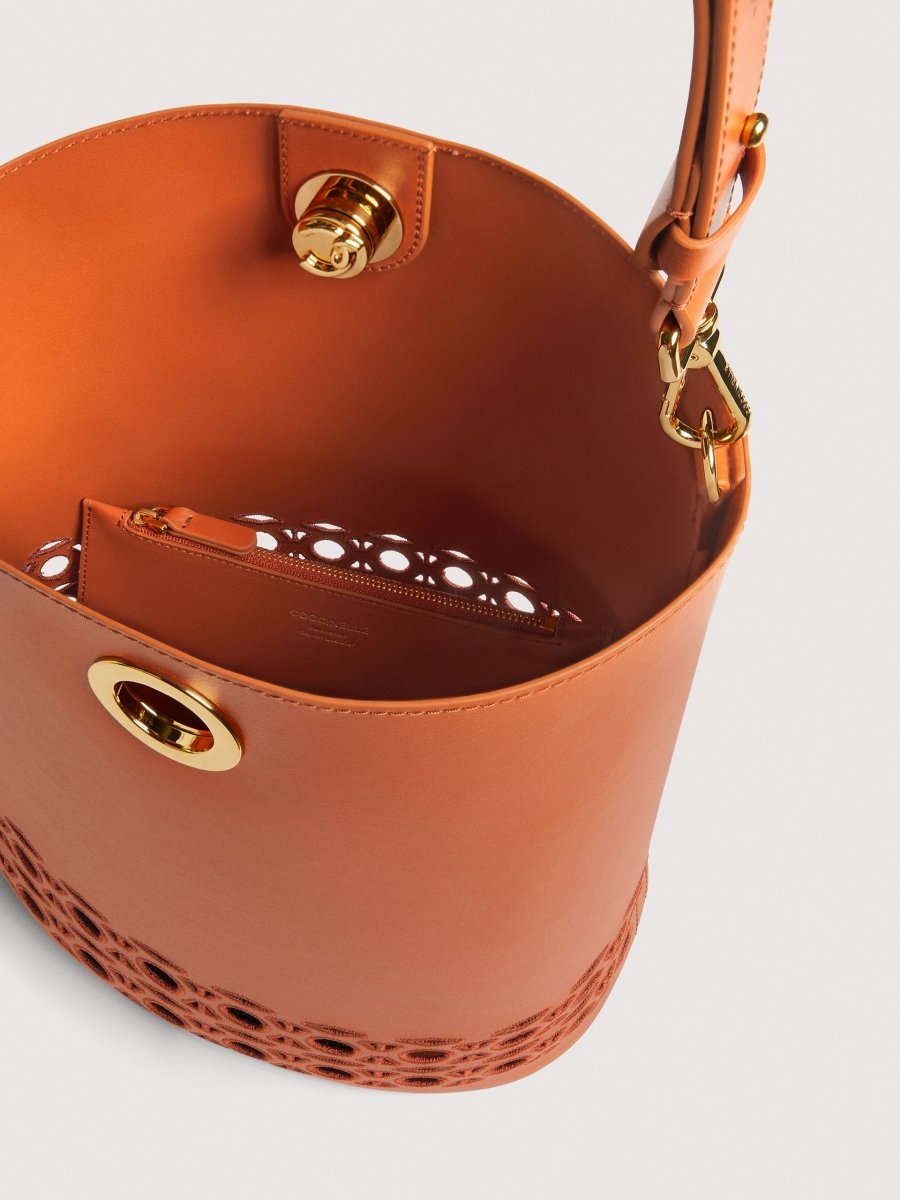 For the Coccinelle Nikla line, the C-Me logo becomes a refined turn lock that elegantly finishes off this bucket bag. Sophisticated and modern, each design blends timeless elegance with a contemporary silhouette, accentuated by the leather’s softness. This model is made from smooth cowhide-effect leather. The leathers are pre-cut to the shape of the bag, then perforated with the Coccinelle monogram pattern and machine-embroidered to create the broderie anglaise effect.