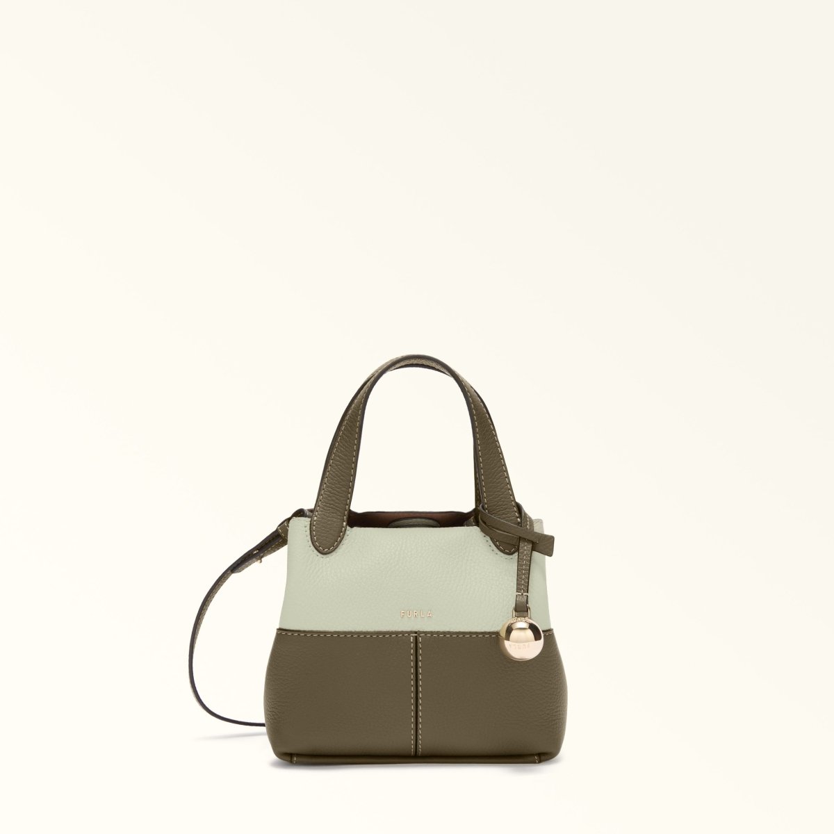 The Furla Primrose mini tote features a structured silhouette in soft textured leather, with a contrasting colour-block palette and decorative details. Equipped with two handles, together with an adjustable and removable shoulder strap, it can be worn in a variety of ways. It fastens with a magnet and inner straps, held together by two snap hooks in the shape of the iconic Arch logo, keeping all of your essentials safe inside its open compartment-free interior.