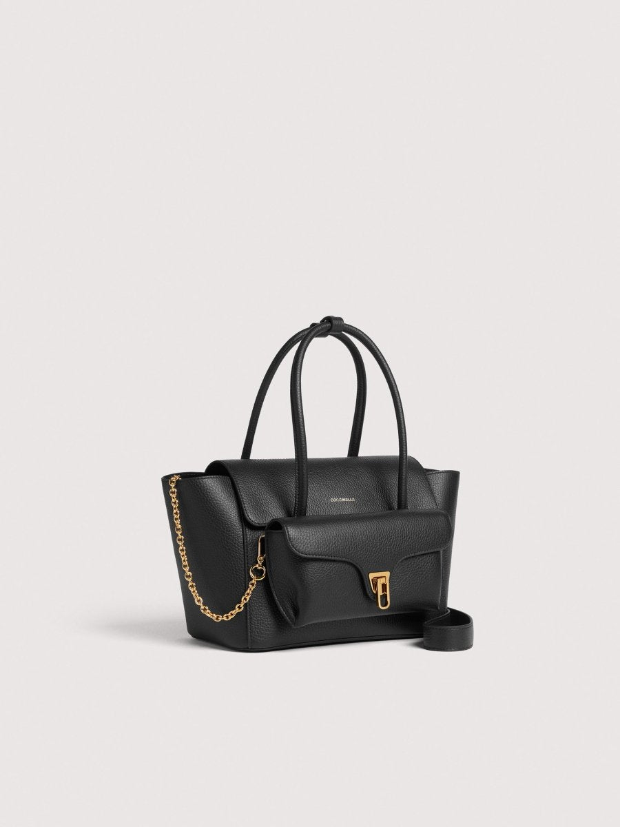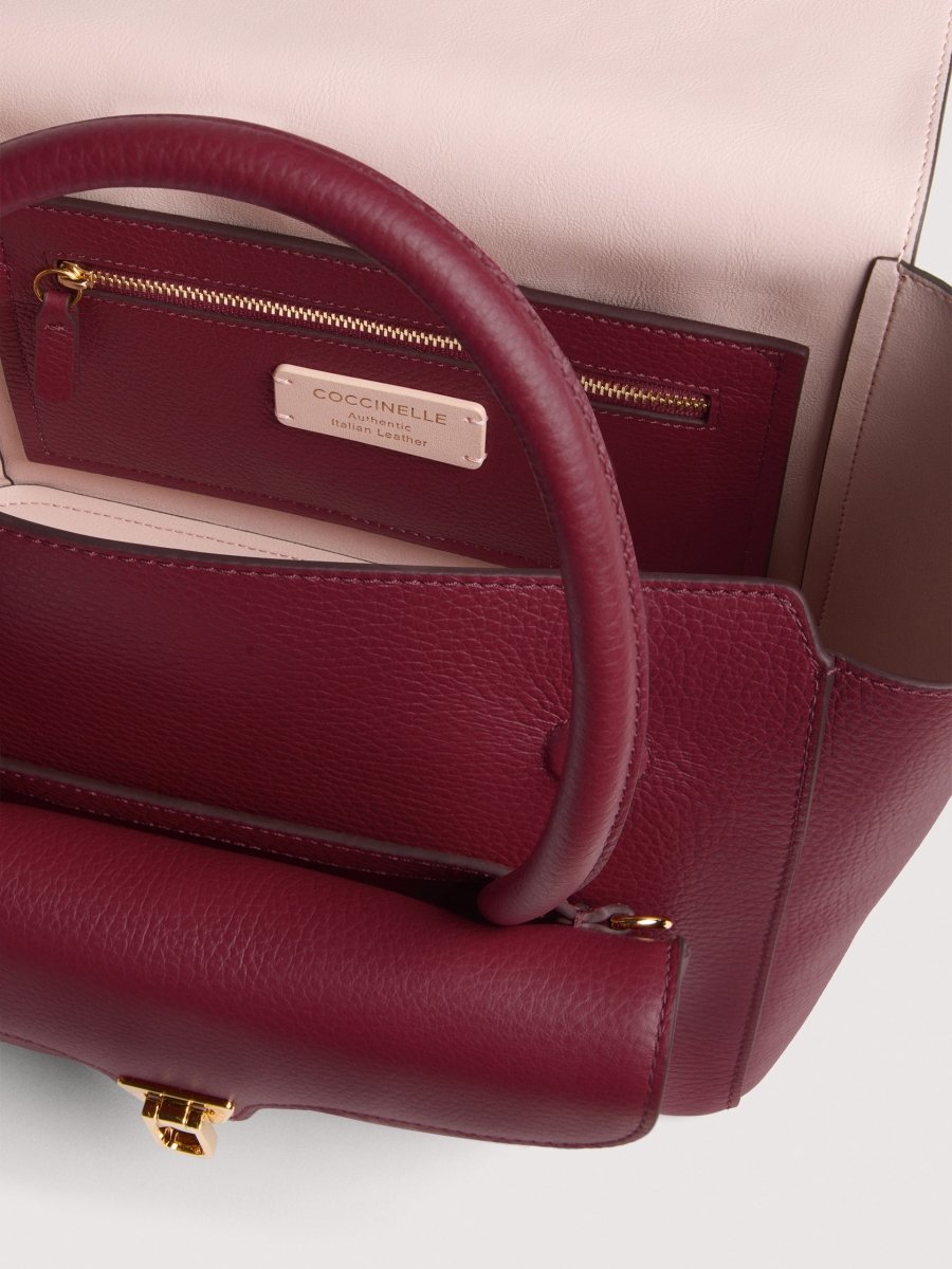 Coccinelle Double Beat is a true daily companion – a spacious flap bag to wear on the shoulder or crossbody, thanks to its tubular handles or the comfortable adjustable shoulder strap. Thanks to its innovative design, the front pocket can be detached and used as an all-purpose pouch or as an elegant clutch bag for special occasions. The pocket is also a symbol of Coccinelle identity, featuring the iconic plectrum detail. This model is made with leather processed using specialised machines and then tumbled to maintain its softness. This is a very robust, easy to clean leather, making it ideal for everyday use.