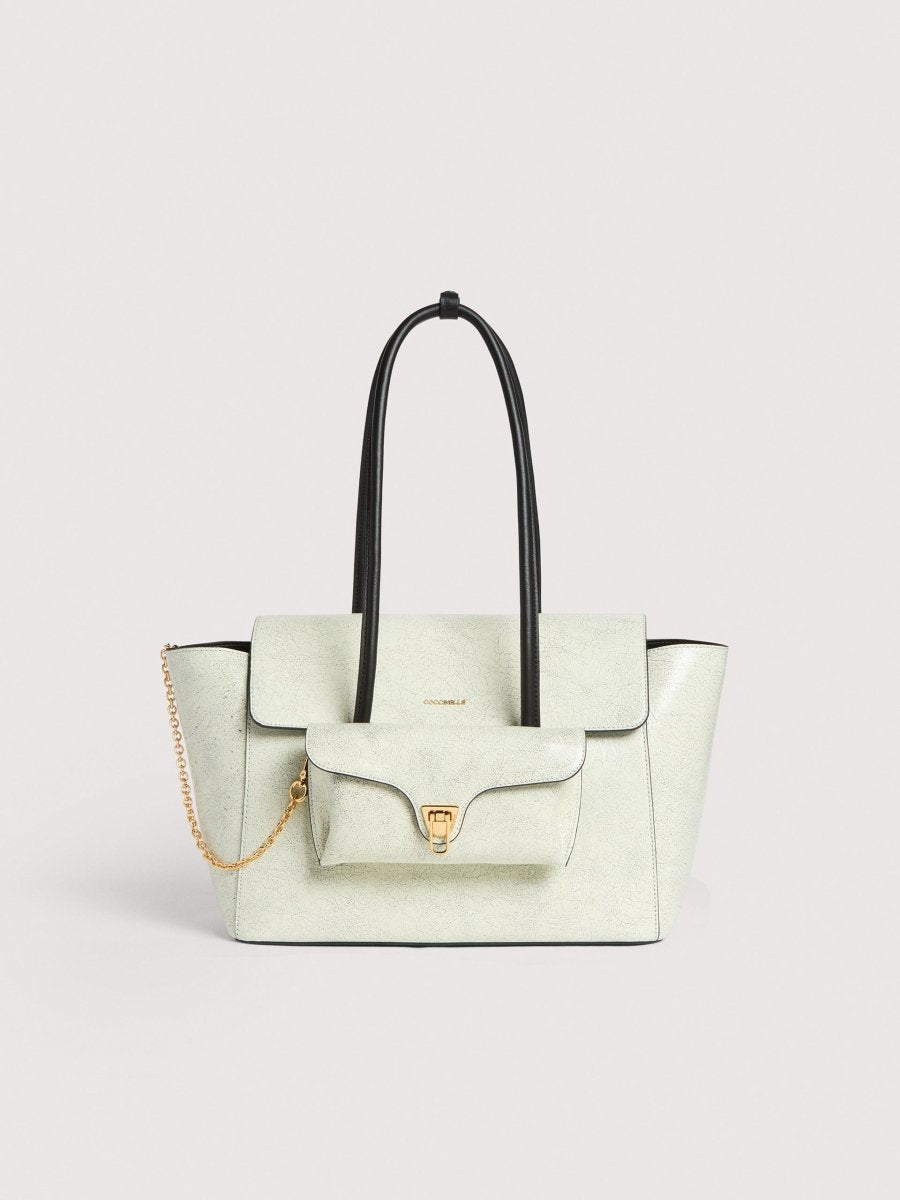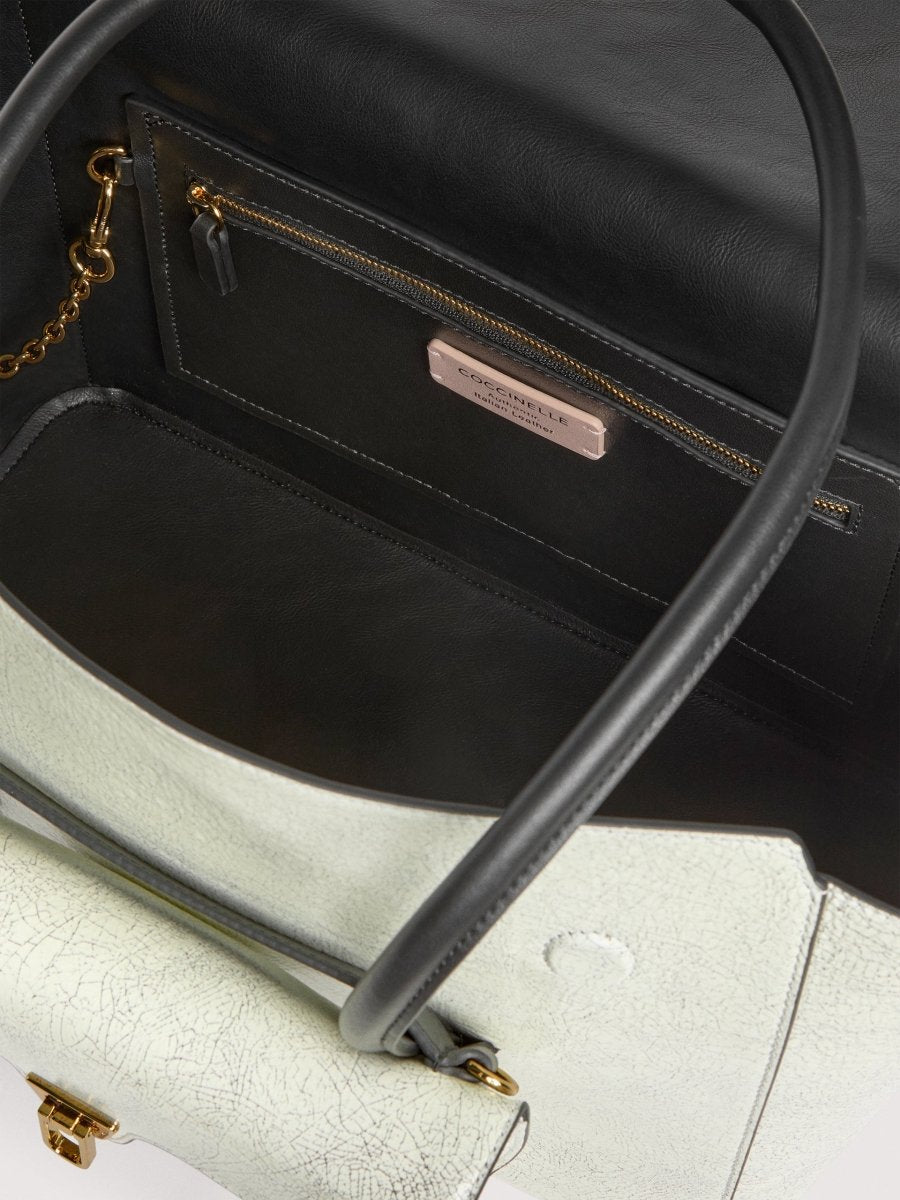 Coccinelle Double Beat is a true daily companion – a spacious flap bag with tubular handles for comfortable shoulder wear. Thanks to its innovative design, the front pocket can be detached and used as an all-purpose pouch or as an elegant clutch bag for special occasions. The pocket is also a symbol of Coccinelle identity, featuring the iconic plectrum detail. This model is made from leather with a special craquelé effect created by applying a layer of non-elastic pigment. The surface is then broken to achieve the desired look and finished with a layer of transparent varnish.