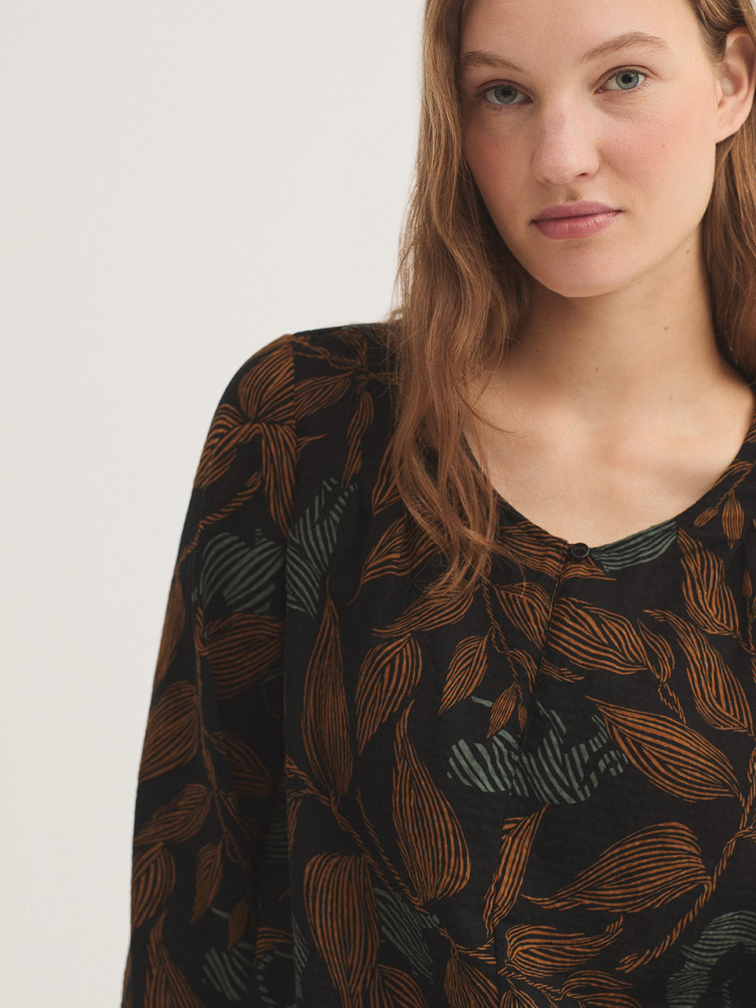 Mesh-knit blouse with Jungle print. Round neck with opening and button. Pleats on the shoulders. Long sleeves with vent, cuff and button.