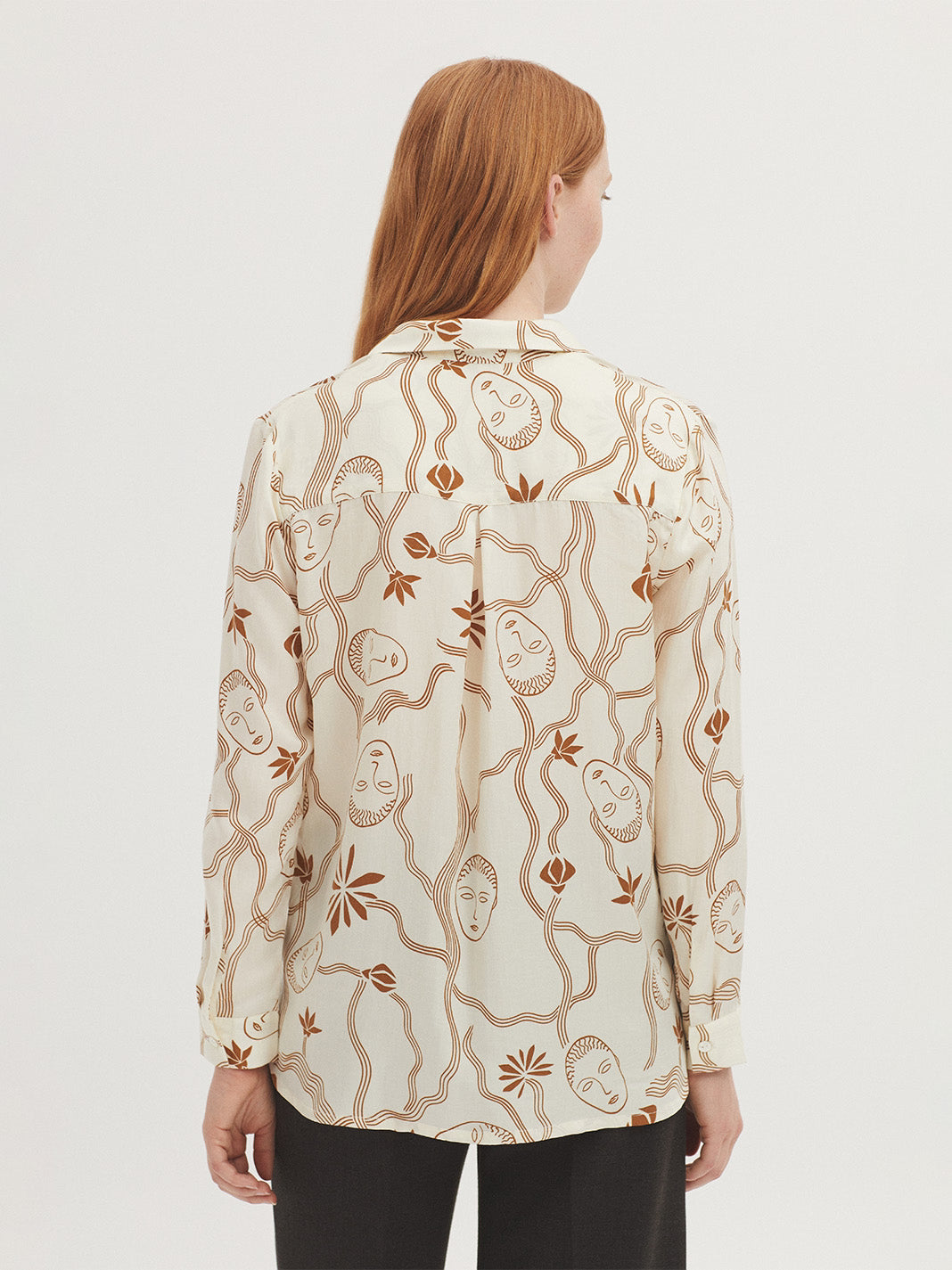 Satin shirt in Tencel fabric with Muses Garden print. Shirt collar and button front. Yoke and pleat on the back. Long sleeves with vent, cuff and button.