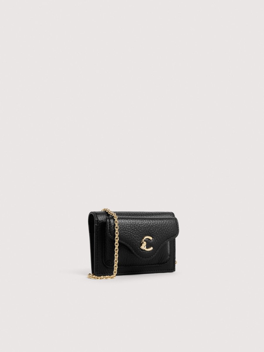 Practical and compact in design, this C-Me line card holder combines functionality with elegance. The logo is reimagined with the C of Coccinelle, knots around and embraces the plectrum, an iconic element of the brand. Finished with an elegant chain shoulder strap, this accessory is also perfect for carrying on the shoulder. This model is made with leather processed using specialised machines and then tumbled to maintain its softness. This is a very robust, easy to clean leather, making it ideal for everyday use. RFID protection.