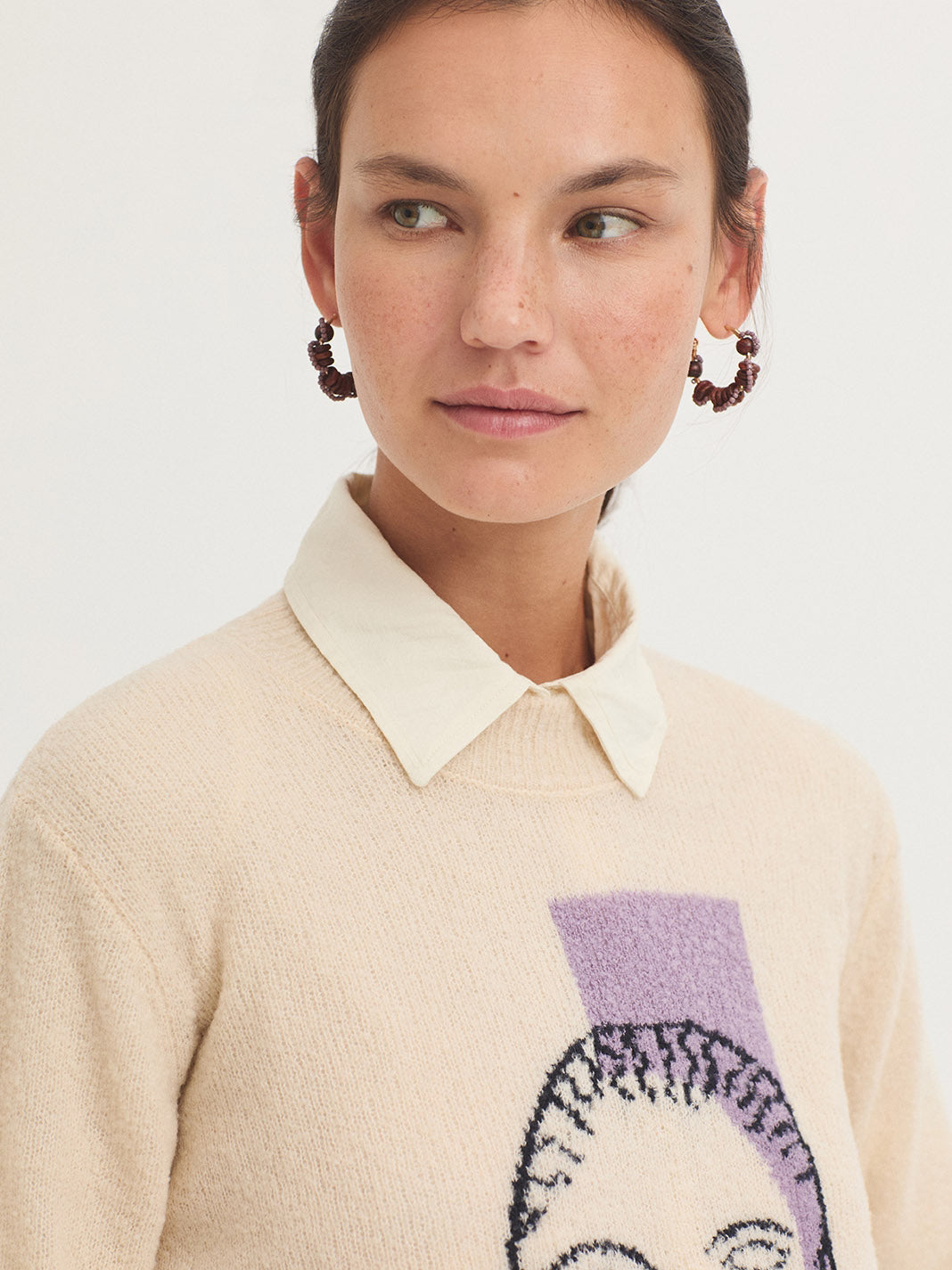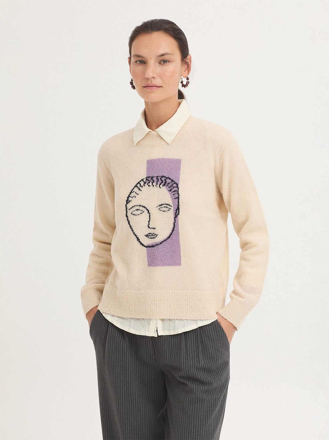 Bouclé wool jumper with intarsia knit on the front. Round neck, long sleeves and ribbed finish.
