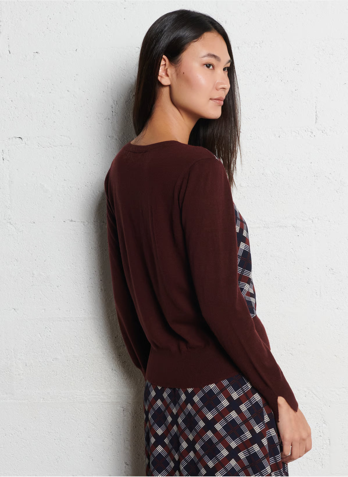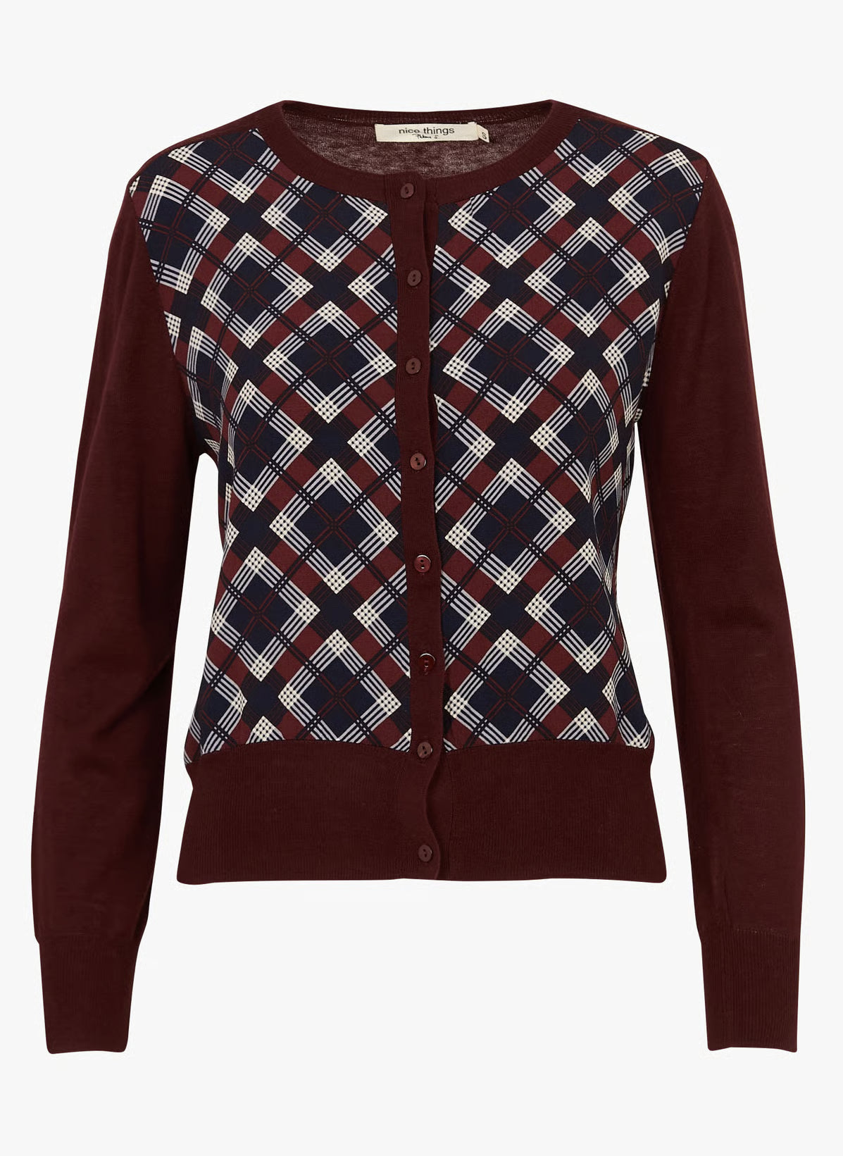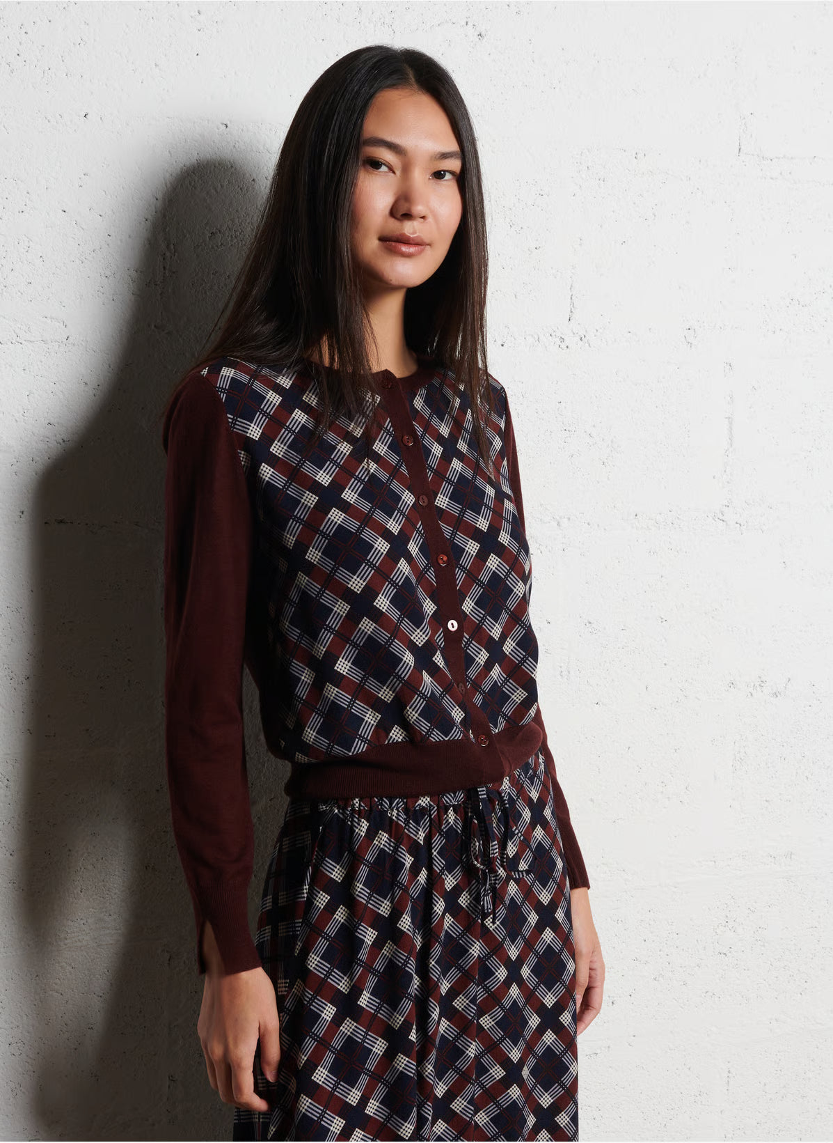 Cardigan in merino wool cashmere blend with round neck and button front. Long sleeves and front Chekere print.