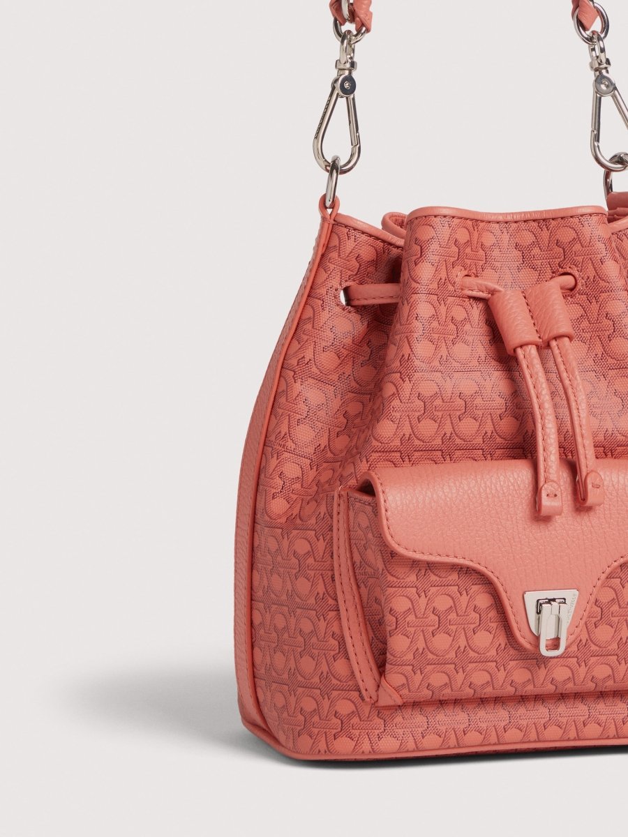 Coccinelle Beat is one of the brand’s iconic lines: the distinctive flap closure with plectrum is the symbol of Coccinelle’s identity, reimagined for this collection with elegant, modern functionality.The mini bucket bag is enhanced by a leather and chain handle, a perfect mix of structure and softness, practicality and contemporary design. This model is made from polyester fabric, on which a special finish has been applied. The fabric is then passed through a specific cylinder engraved with our monogram pattern.