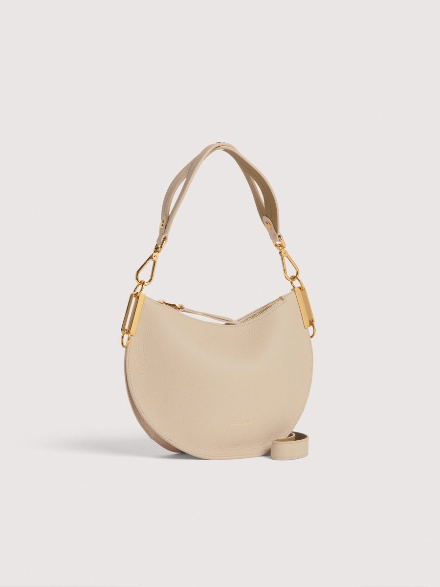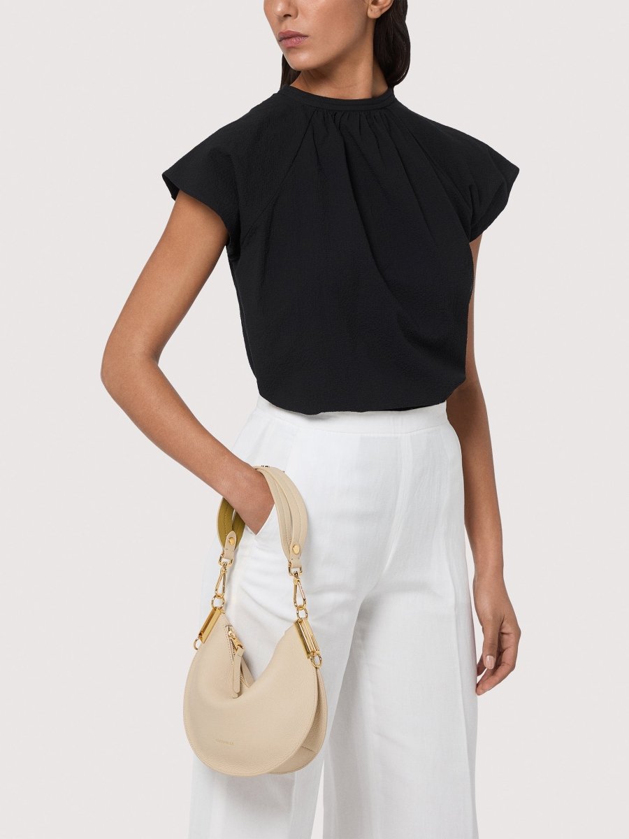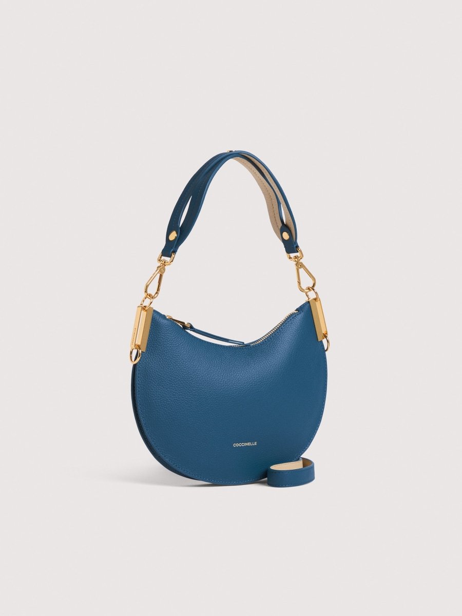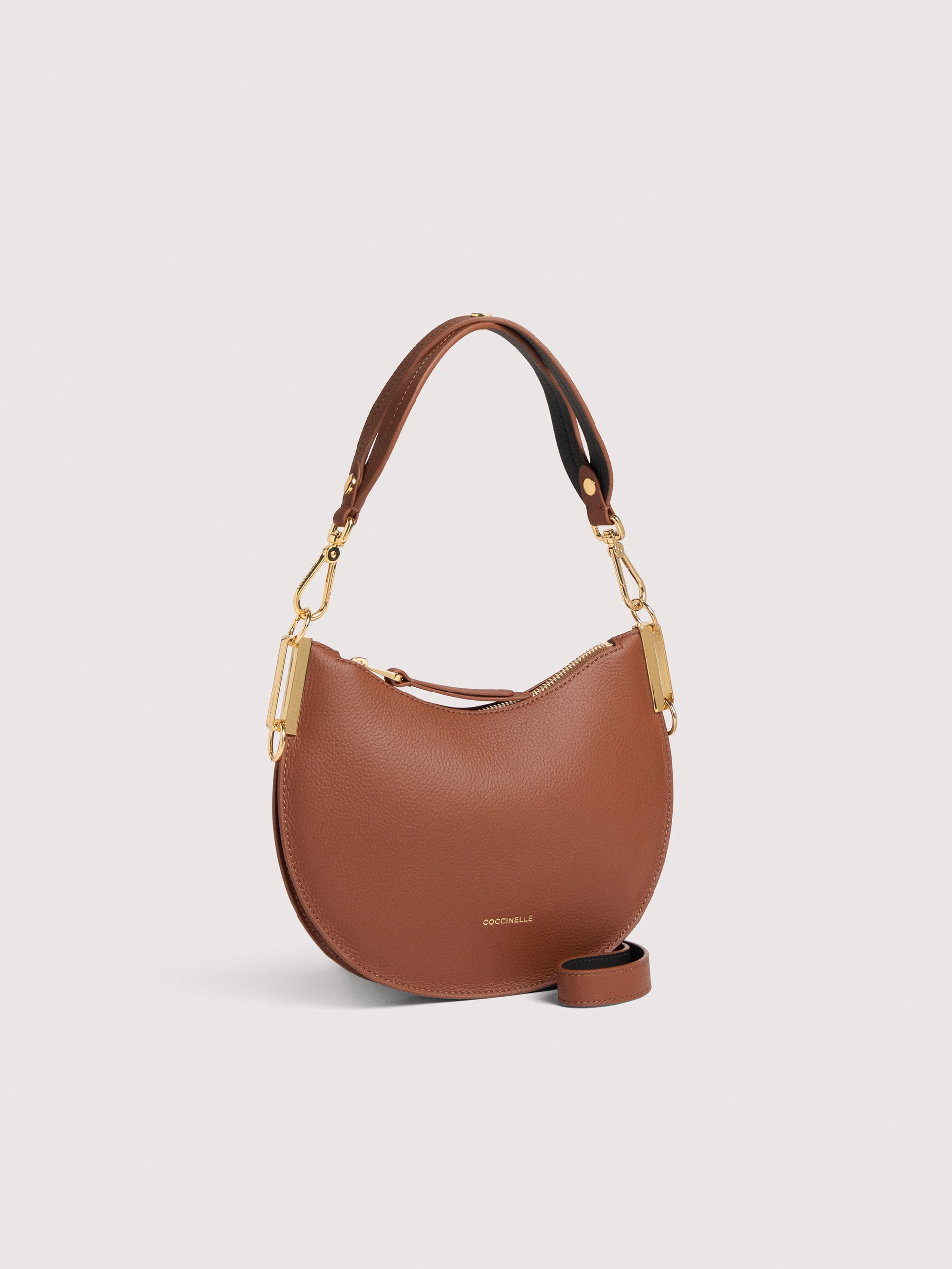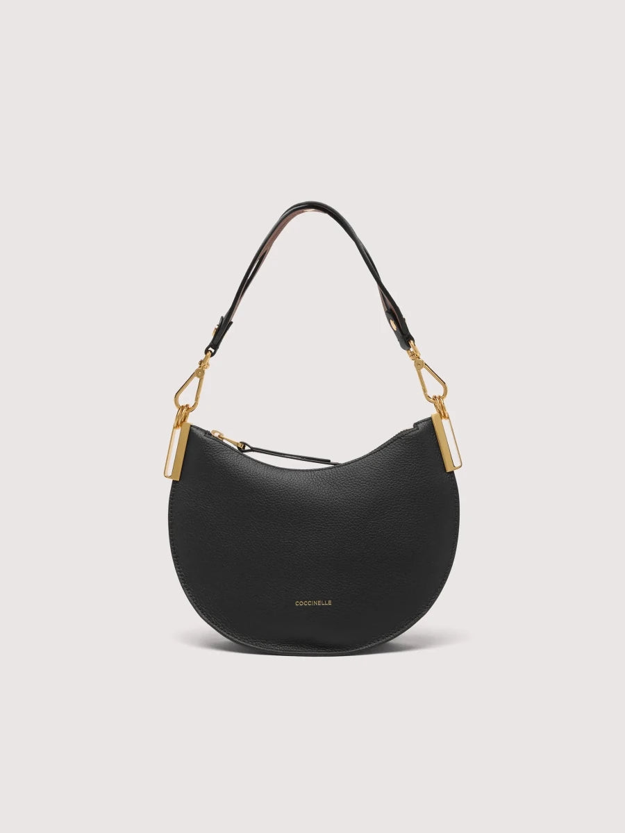 The roundness of its silhouette, also reflected in its name, is the hallmark of the Coccinelle Sunup line. The handle is the line’s distinguishing element, modelled on the same feminine curves that draw a sinuous weave, giving it a touch of originality. The two-sided leather enhances the softness and lightness of the bag, due also to the unlined interior, adding an original twist thanks to the play of contrasting colours. This model is made with leather processed using specialised machines and then tumbled for an extremely soft finish. This particular type of leather is finished with pigments on both sides to create a two-sided effect. It is made from a robust material, making it suitable for everyday use.