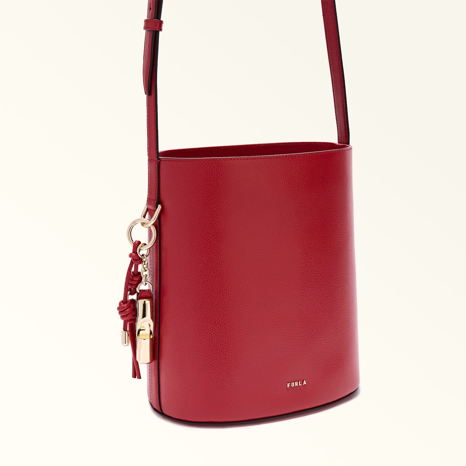 Furla Roxie is a small, compact bucket bag for keeping your essentials close. Featuring a soft and flexible base, its structured design is elevated by precious leather with a printed finish. This accessory sits comfortably in the hand, but can also be worn across the body using its fixed adjustable strap with stud buttons. A detachable cylindrical charm with two braided cords adds a distinctive touch.
