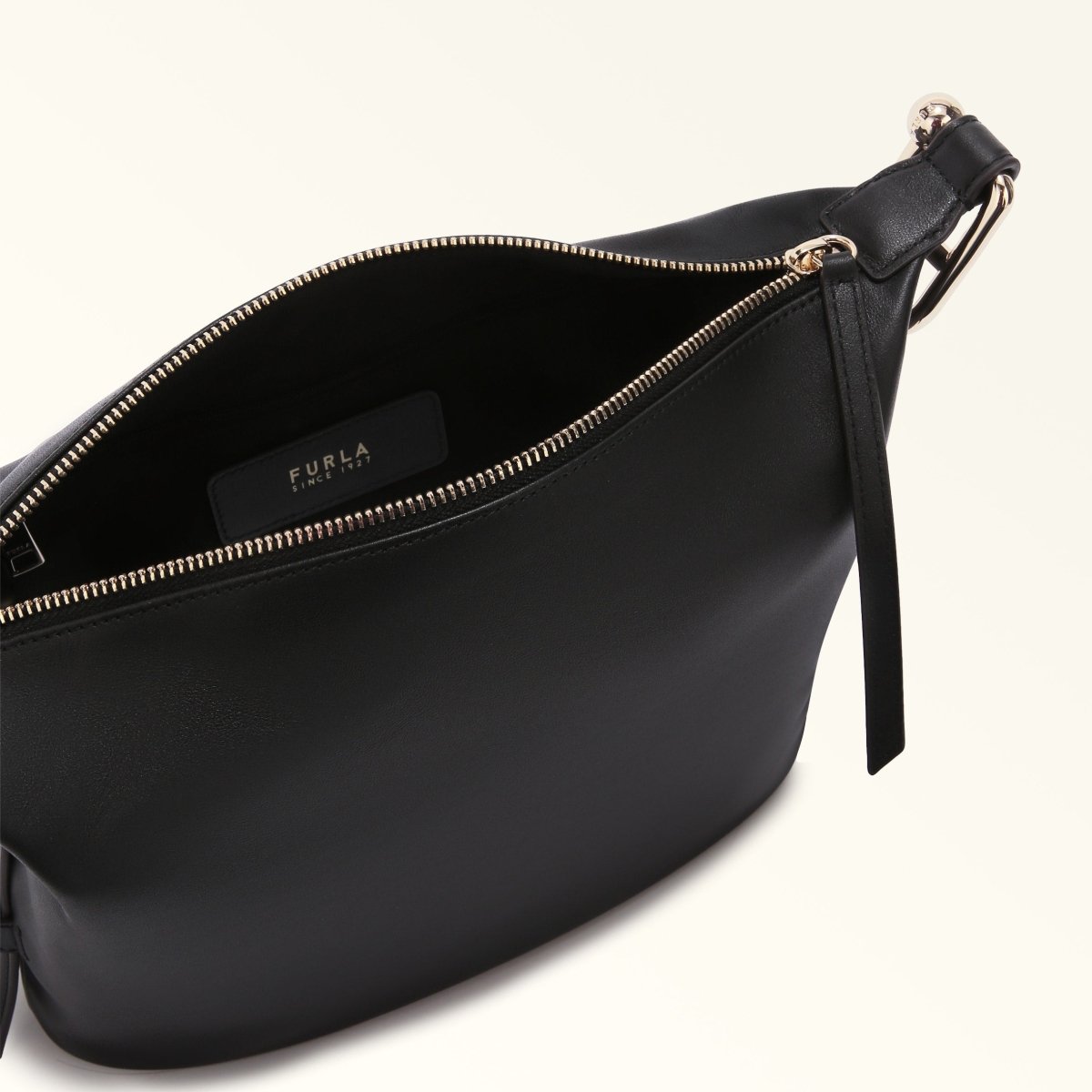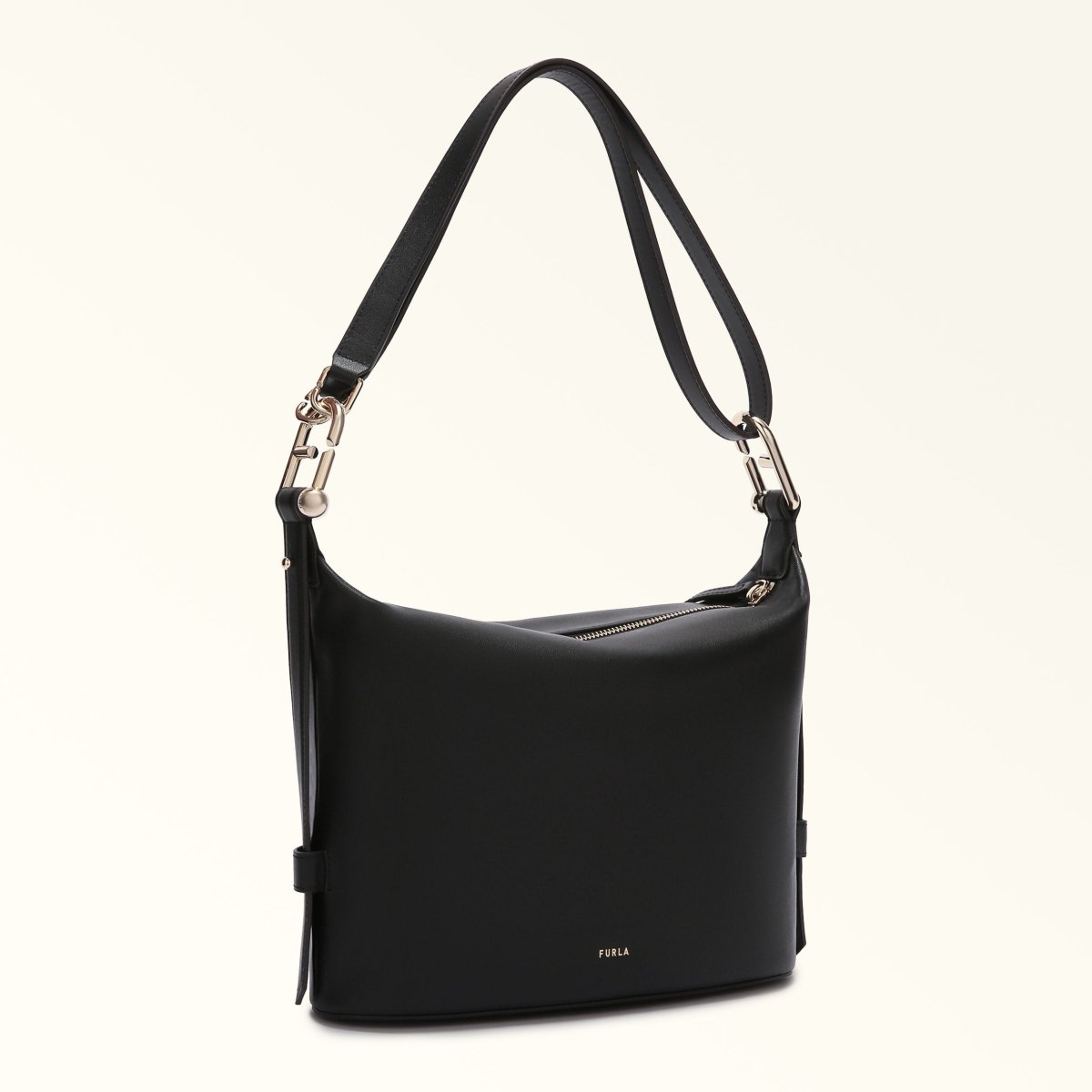 This stylish, compact Furla Nuvola hobo bag boasts geometric lines and a delicate design, and is styled in soft leather with a natural grained finish. The spacious interior features one open compartment suitable for storing all essentials. The removable, adjustable handle stands out thanks to the new version of the Arcosfera hardware, which brings the iconic Furla Arch logo together with the brand's original spherical hallmark.