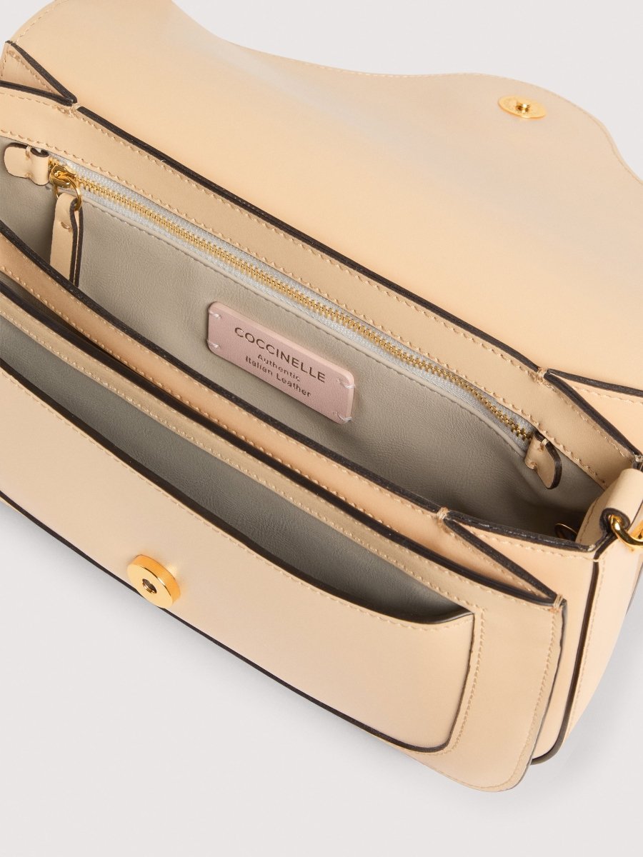 A new signature joins the brand: Coccinelle C-Me. The logo is reimagined with the C from Coccinelle, which knots around and embraces the plectrum - an iconic element of the brand - symbolising the intertwining of a woman’s life between past and present. The geometric lines and elegant curves elevate the design, while the gusseted construction brings a blend of functionality and understated elegance to this bag, intended to be the essential companion for the Coccinelle woman throughout her day. This model is made with smooth leather, tanned with special oils to give it a durable and refined appearance.