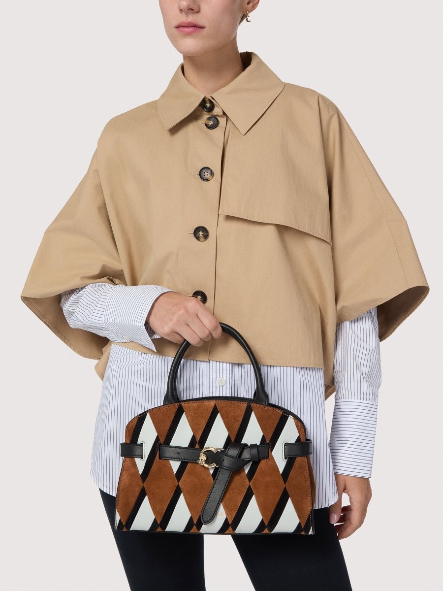 The Coccinelle Sabine line plays with contrasts, pairing structure and softness, while reinterpreting the iconic C-Me logo as a belt detail with a distinctive contemporary twist. This bag is made using a special patchwork technique and is designed for carrying by hand. The additional detachable shoulder strap offers a second carrying option. This model is created by stitching together strips in different materials and colours to form the desired pattern.