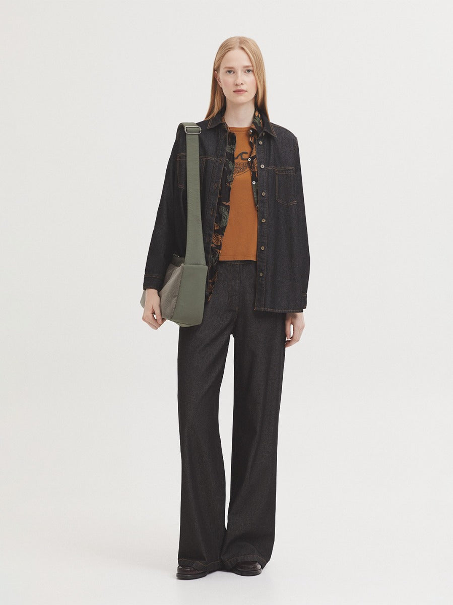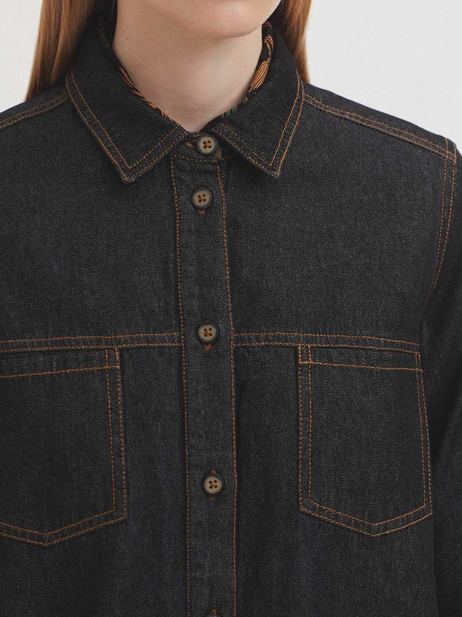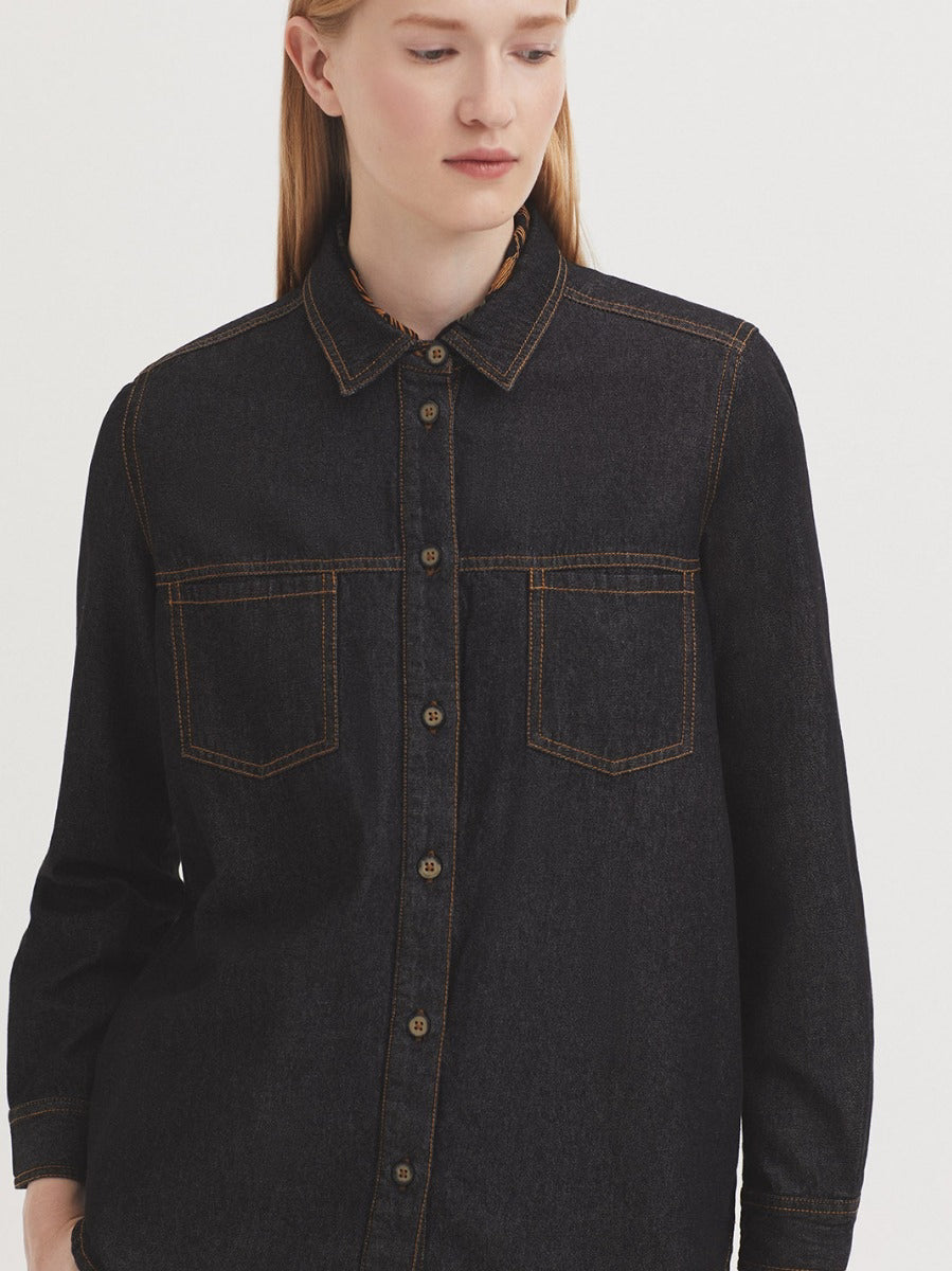 Grey sustainable cotton denim shirt, with shirt collar, front yoke and chest pockets. Back yoke. Long sleeves with vent, cuff and button.