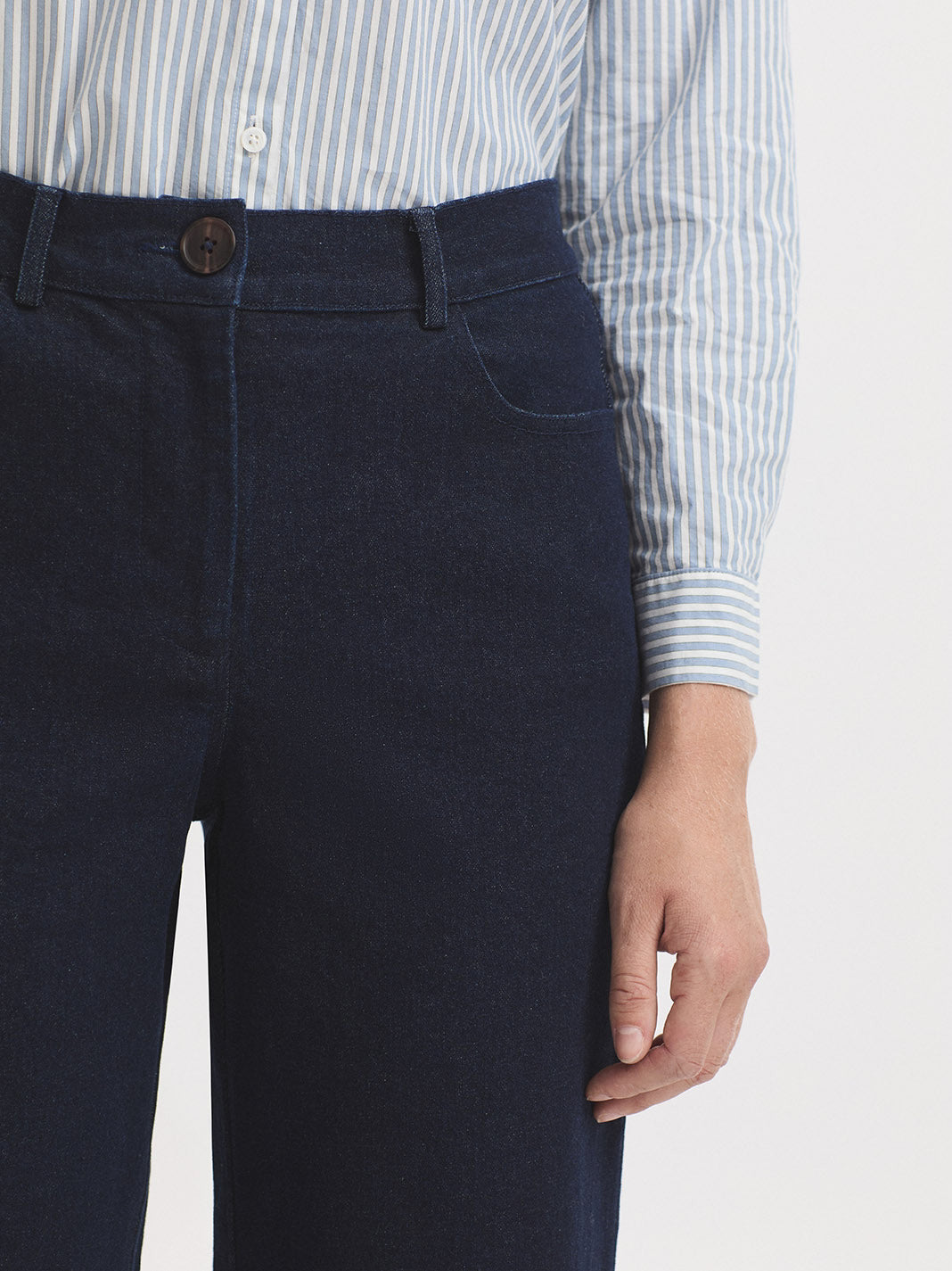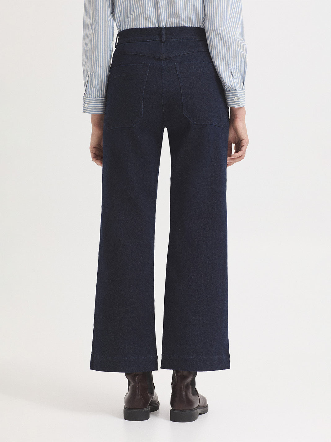 Sustainable stretch cotton denim jeans, front fastening with zip and button. Front scoop pockets and back patch pockets. Belt loops. Wide leg.