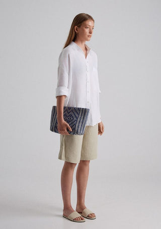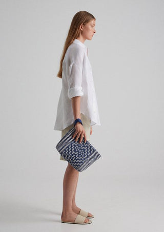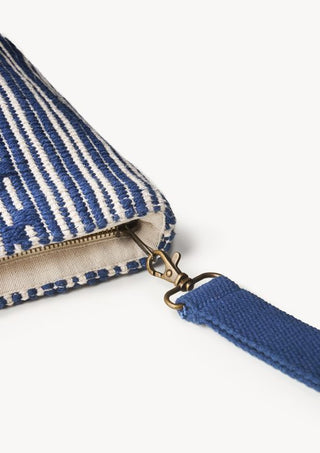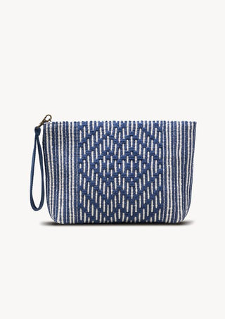Handcrafted from durable cotton, our Palmaria clutch boasts a unique geometric print on a dual-tone base. Lightweight and flat-packable, it features antique gold accents, a wrist strap, and versatile use for summer and tech essentials.