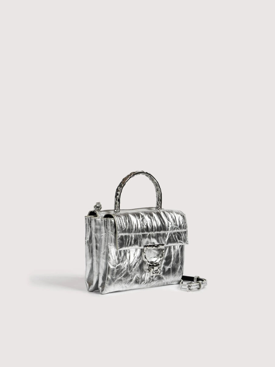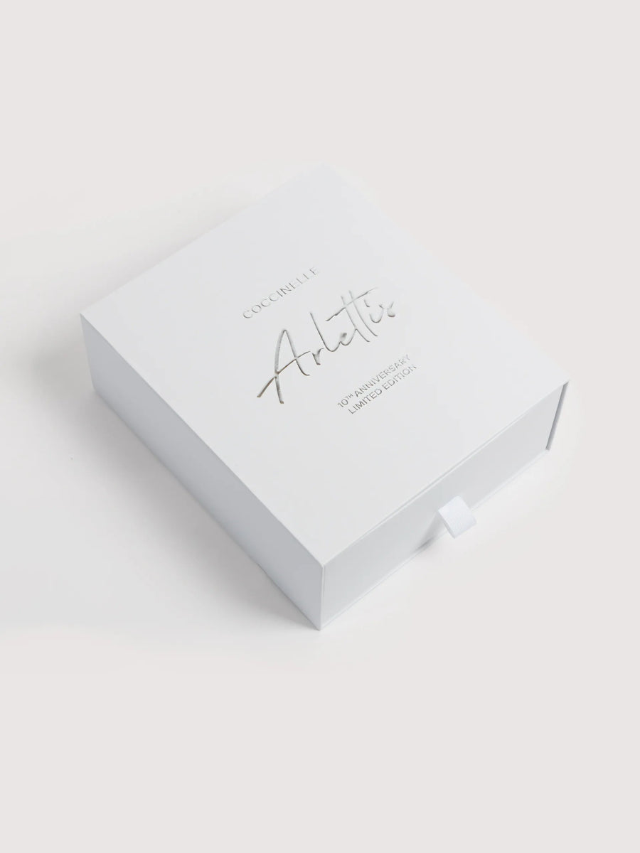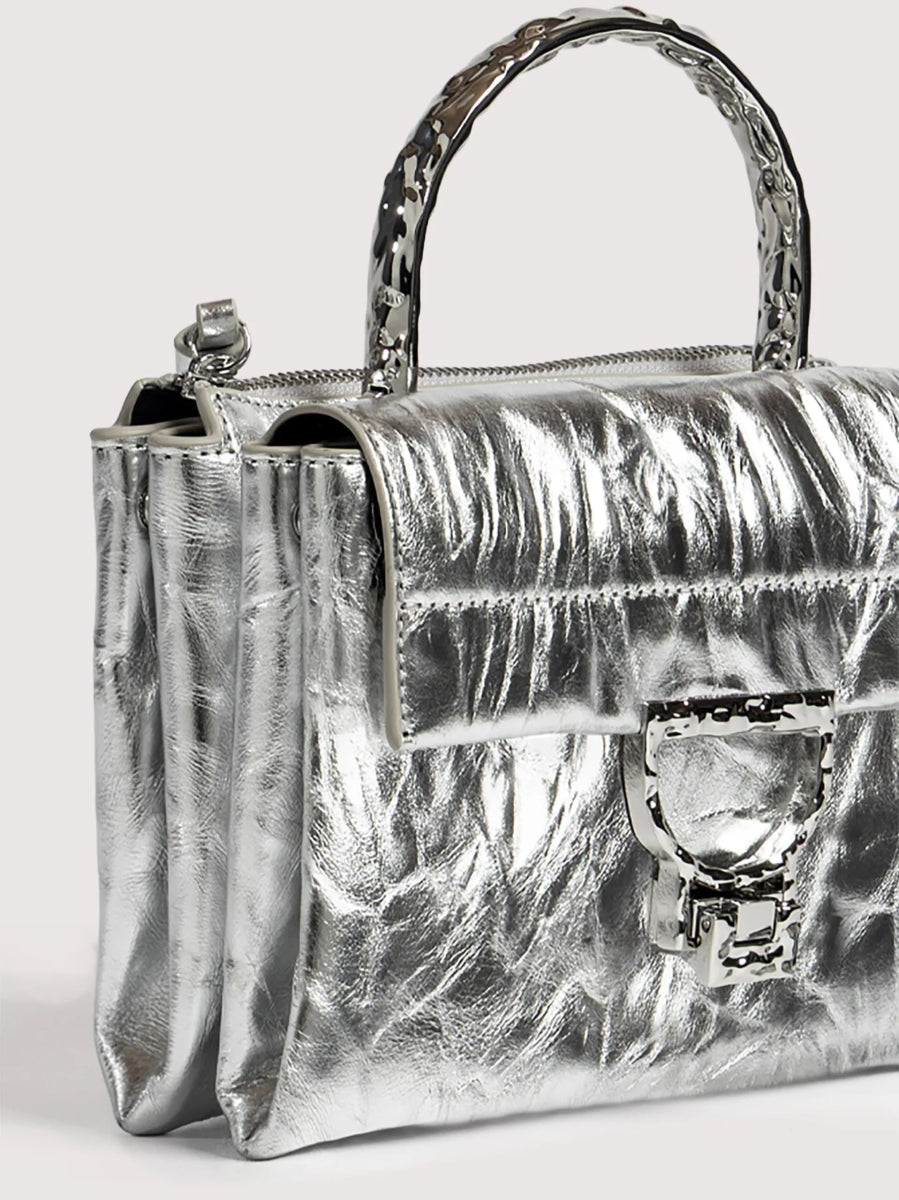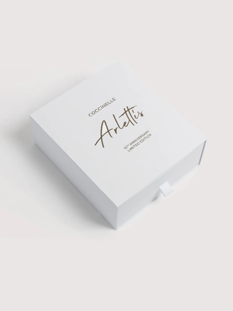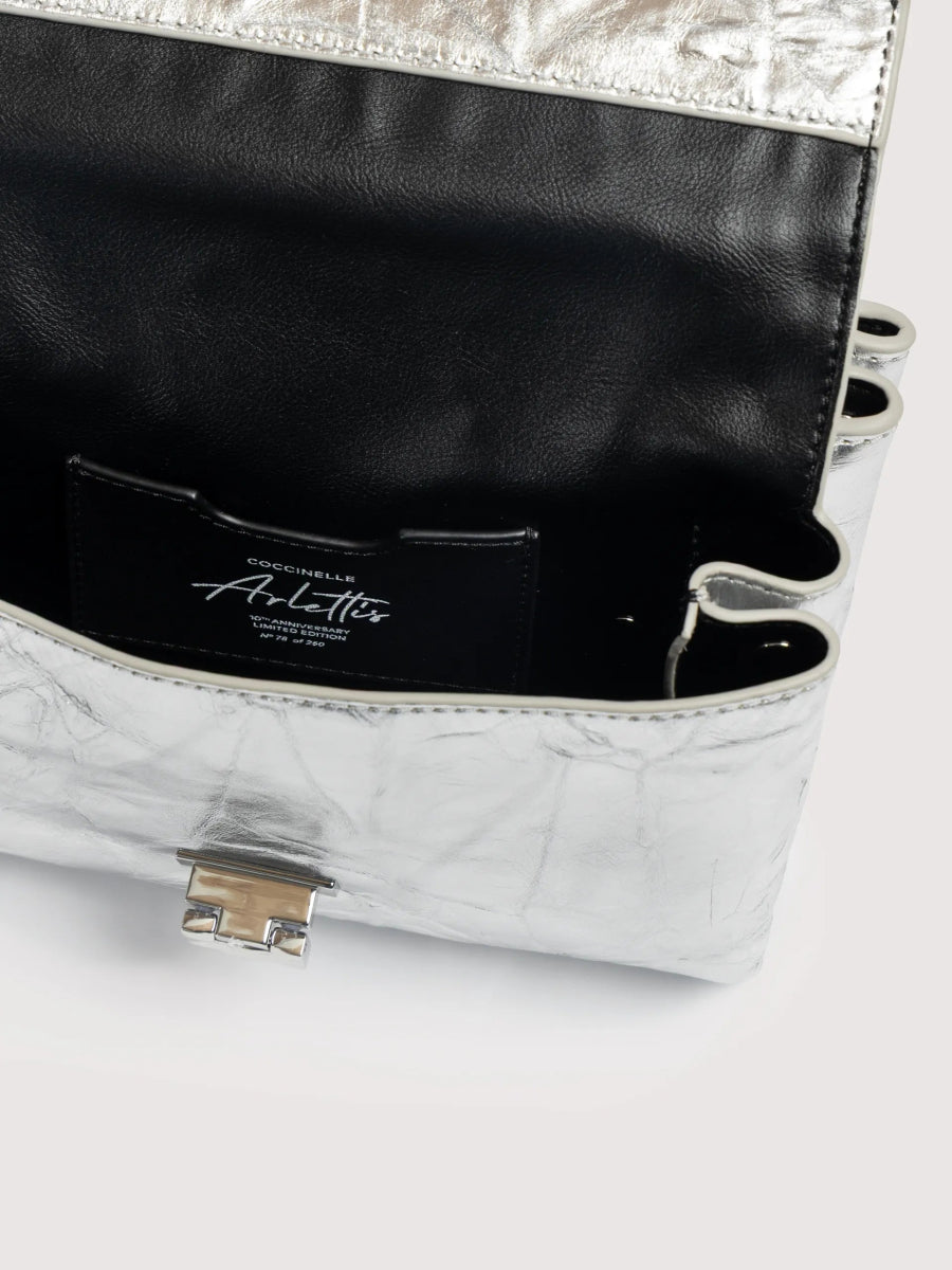 The Arlettis line has been a signature of the Coccinelle brand since 2015, perfectly balancing elegance and character. Fine leather is paired with sophisticated metallic details, including the iconic clasp that reinterprets the letter “C”, the brand’s initial, in graphic form. To celebrate its tenth anniversary, Arlettis gets a festive makeover and becomes a truly precious piece. Every element is designed to evoke the value of the finest metals, from the liquid-effect finish of the metalwork to the laminated leather, treated with a special wrinkling technique that gives it a unique three-dimensional shine. This exclusive limited edition includes a numbered inner label marking its uniqueness and comes in specially designed and customised packaging created to mark the occasion. This model is made from laminated smooth leather, treated with a special wrinkling technique that gives it a unique three-dimensional shine.