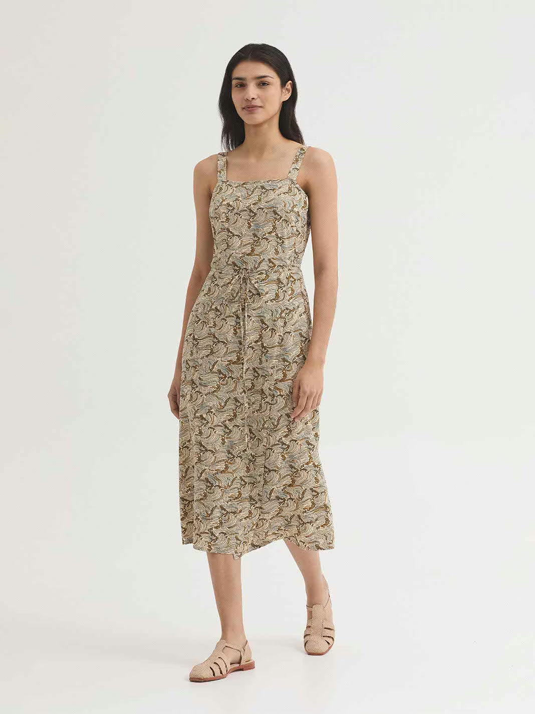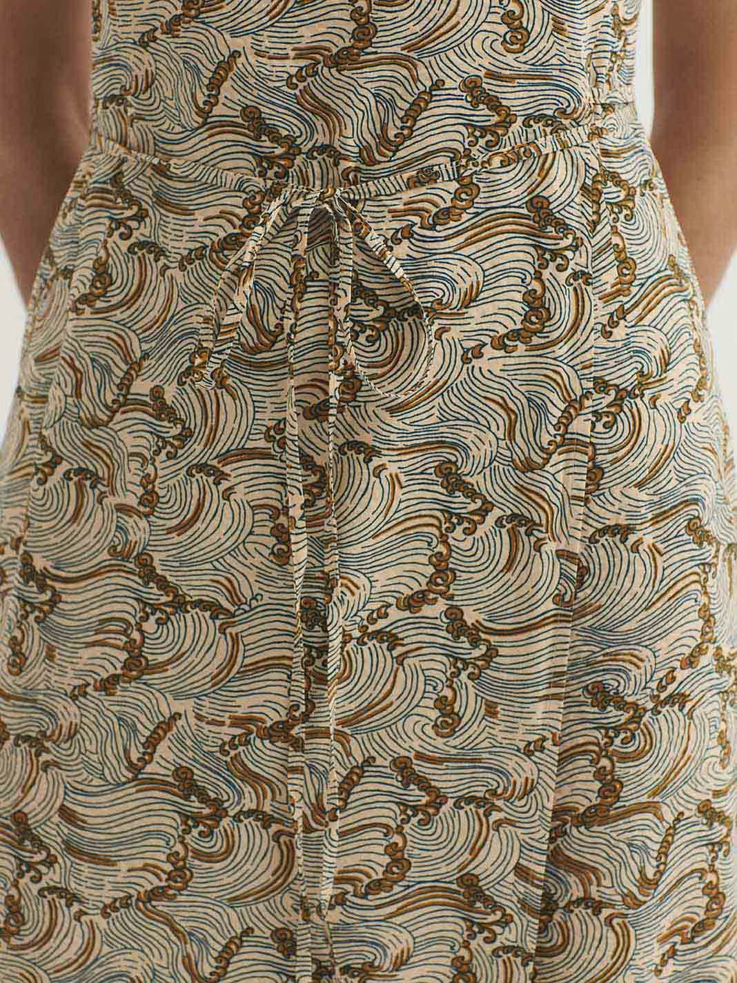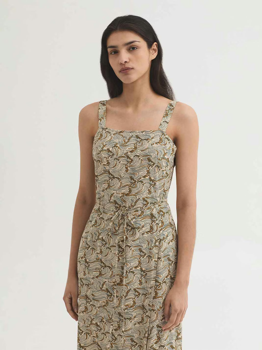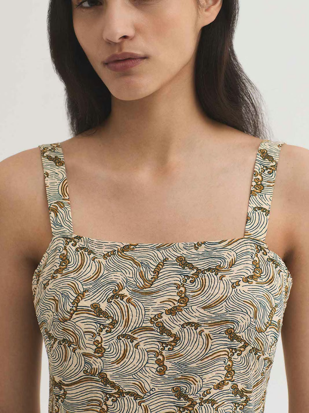 Mesh-knit fabric dress with Aegean Sea print. Straps, square neck, concealed side zip and wrap skirt with self-fabric ties for cinching.